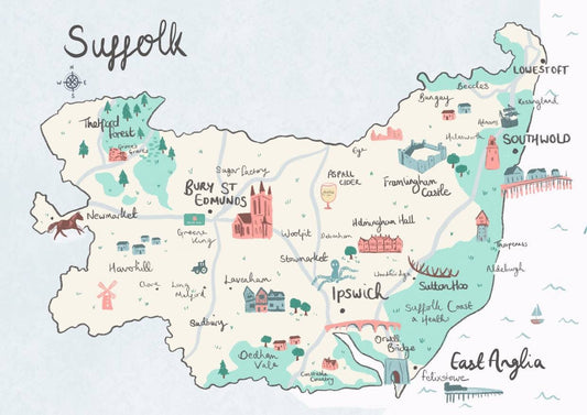Suffolk County Illustrated Map - Ipswich, Lowestoft, Southwold etc